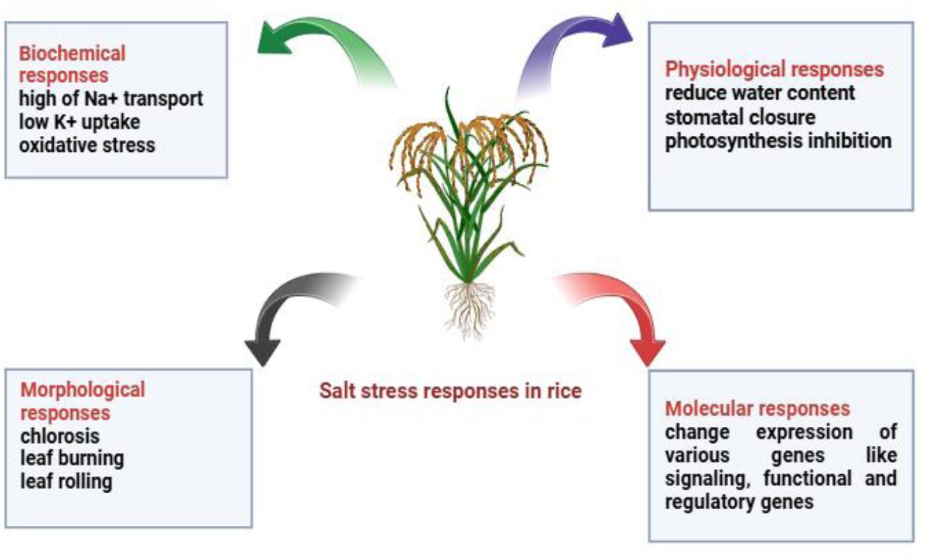 The main plant reactions to salt stress in rice are depicted in Fig. (2). Rice is impacted by salt stress in several ways: In rice, morphological, physiological, biochemical and molecular reactions are triggered by salt stress. These include decreased photosynthesis, ion imbalance, damaged leaves and altered gene expression. When combined, these reactions aid in the plant’s capability to resist salinity.