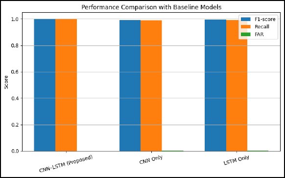 CNN and LSTM baselines were constructed using matched parameter budgets and identical training regimes to ensure fair comparison. All models weretrained using the same optimiser, learning rate schedule, batch size, and early stopping criteria. In addition, a classical machine-learning baseline using XGBoost was included to contextualise deep learning performance against established non-neural IDS approaches. The efficiency of the suggested hybrid architecture is also presented by the comparison with CNN-only and LSTM-only baselines in Figure 11. Although both baseline models are very strong in terms of their overall performance, neither of them can be compared to the overall performance of the CNNLSTM architecture in all of the metrics. The CNN-only model boasts of good feature extraction, and the LSTM-only model captures time dependencies but works on lower-expressive features. This high performance of the hybrid model justifies that a combined modelling of correlations between features and time dynamics produces quantifiable performance improvements.