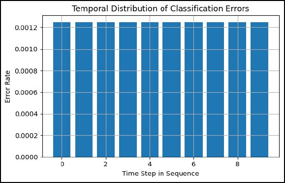 In Fig. (13), the temporal robustness is studied by the distribution of classification errors at different sequence positions. There is a uniform distribution of errors throughout the time steps, meaning that the model does not rely on one specific location too much in the sequence. Moreover, Figure 14 indicates that the feature activations are consistent over time steps, which implies that the representations learnt are not leapt or collapsed during the temporal processing. These findings confirm that the model does not learn temporal patterns but makes use of short-term artefacts.