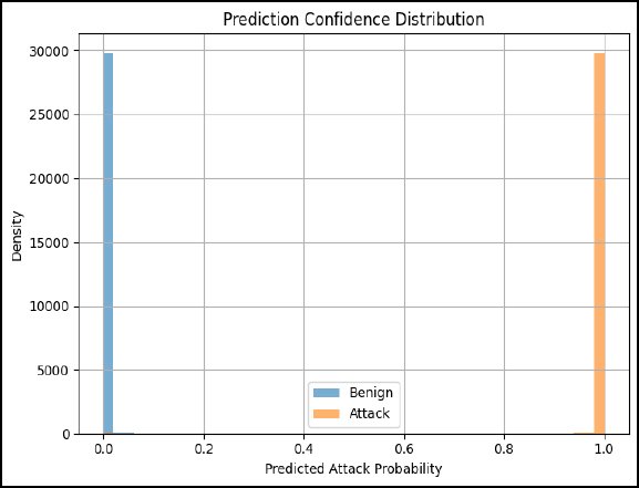 (Fig. 15) demonstrates that the distribution of prediction confidence in the figure is well separated, with benign and attack sample prediction probabilities having a thin boundary between them. High model confidence implies high prediction accuracy. Calibration performance is also evaluated with the help of the reliability diagram in Figure 16, which shows that those predicted probabilities are very well aligned to empirical frequencies of outcomes. Risk-aware decision making in IIoTs requires well-calibrated probabilities: probabilistic outputs can be used to drive automated (or human-in-the-loop) responses.