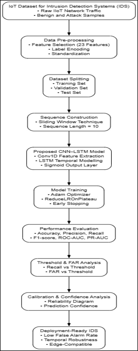 In short, current intrusion detection solutions for the IoT and IIoT networks have three major limitations. To begin with, most hybrid deep learning IDS focus on the accuracy of classification and do not consider the cost of the operation of false alarms, which is of paramount importance in the industrial sector that requires safety. Second, the literature does not typically examine temporal stability, so there is an open question regarding the behaviour of models at various levels of traffic sequences. Third, it lacks calibration and threshold-sensitive analysis, which makes it difficult to trust the implementation of these systems in any IIoT infrastructure. The paper explicitly tackles these limitations through the proposition of a lightweight CNN–LSTM intrusion detection system and its test with imbalance-sensitive metrics, false alarms evaluation, calibration evaluation, and time-resilience evaluation, thus filling the gap between the academic performance and the industrial usability.