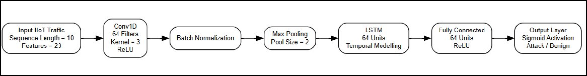 Nevertheless, CNNs do not suffice to learn how to model the temporal dynamics of attacks, which is critical in IIoT settings. The ability of recurrent architectures to learn long-range temporal dependencies and the potential of recurrent architectures, and especially Long Short-Term Memory (LSTM) networks, to model sequential patterns in network traffic have been demonstrated. A hybrid architecture can be used to simultaneously learn the spatial feature interactions and temporal attack dynamics by using CNN-based feature extraction and LSTM-based temporal modelling [7]. IIoT deployments impose strict constraints on computational complexity, memory footprint, and inference latency, particularly when intrusion detection must be executed on edge gateways or industrial controllers. In this work, we explicitly addressed these constraints by designing and evaluating a lightweight CNN–LSTM intrusion detection model that balances detection performance with computational efficiency, enabling practical deployment in resource-constrained IIoT environments [8].