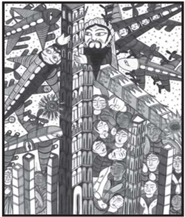 One of the key elements of the concept of hybridity in this image is the central bearded figure towering over the scene in an omniscient and authoritative manner. In classical Pattachitra, the gods and the celestial beings used to be portrayed at the top of the composition, overseeing human affairs with the divine order, as highlighted in Fig. (5) by (Mondal, 2022). However, in this instance, the figure's demeanour, attire, and placement surrounding the context could be interpreted as an unidentified political figure, a provider of surveillance, or even an abstract figure/portrait representing power and control. The way post-colonial artists reuse the traditional visual motifs and give them new meanings, often political, is exemplified in this reinterpretation of divine positioning within a modern, global tragedy. Also, it shows how Pattachitra is no longer a tool of religious devotion but a medium of global socio-political critique through the fusion of folk aesthetics and contemporary anxieties as shown in Fig. (7).