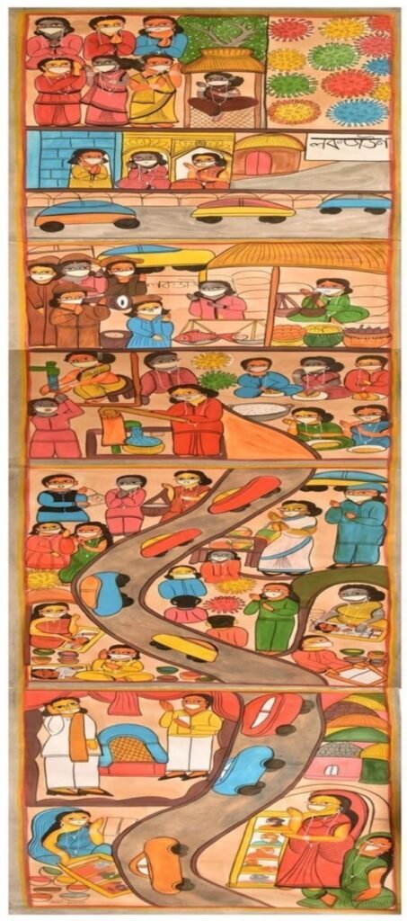 The other significant change has to do with the use of depth and layering. In classical Pattachitra, a flat linear perspective was followed wherein the elements were placed in a hierarchical order, not a spatial one. However, on 9/11, artwork does not follow this rule, overlapping buildings and figures/pictures to simulate the dimension of the space and movement. The COVID-19 scroll painting experiments in a similar vein with modern urban imagery (roads, cars, hospitals) draw upon the adaptation of Pattachitra’s composition to the context of the contemporary space. However, Fig. (10) by (Zanatta & Roy, 2021) also presented the incident of COVID-19, but this is different in pattern, including multiple aspects blending the modern and traditional contexts.