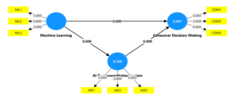 Table 5 shows the model’s explanatory power. The AI recommendation system’s R-Square is 0.160, or 16%, showing that 16% of the variation in the AI recommendation system can be explained through ML. Consumer decision-making’s R-Square is 0.481, or 48%, showing that 48% of the variation in Consumer decision-making can be explained through ML and the AI recommendation system.